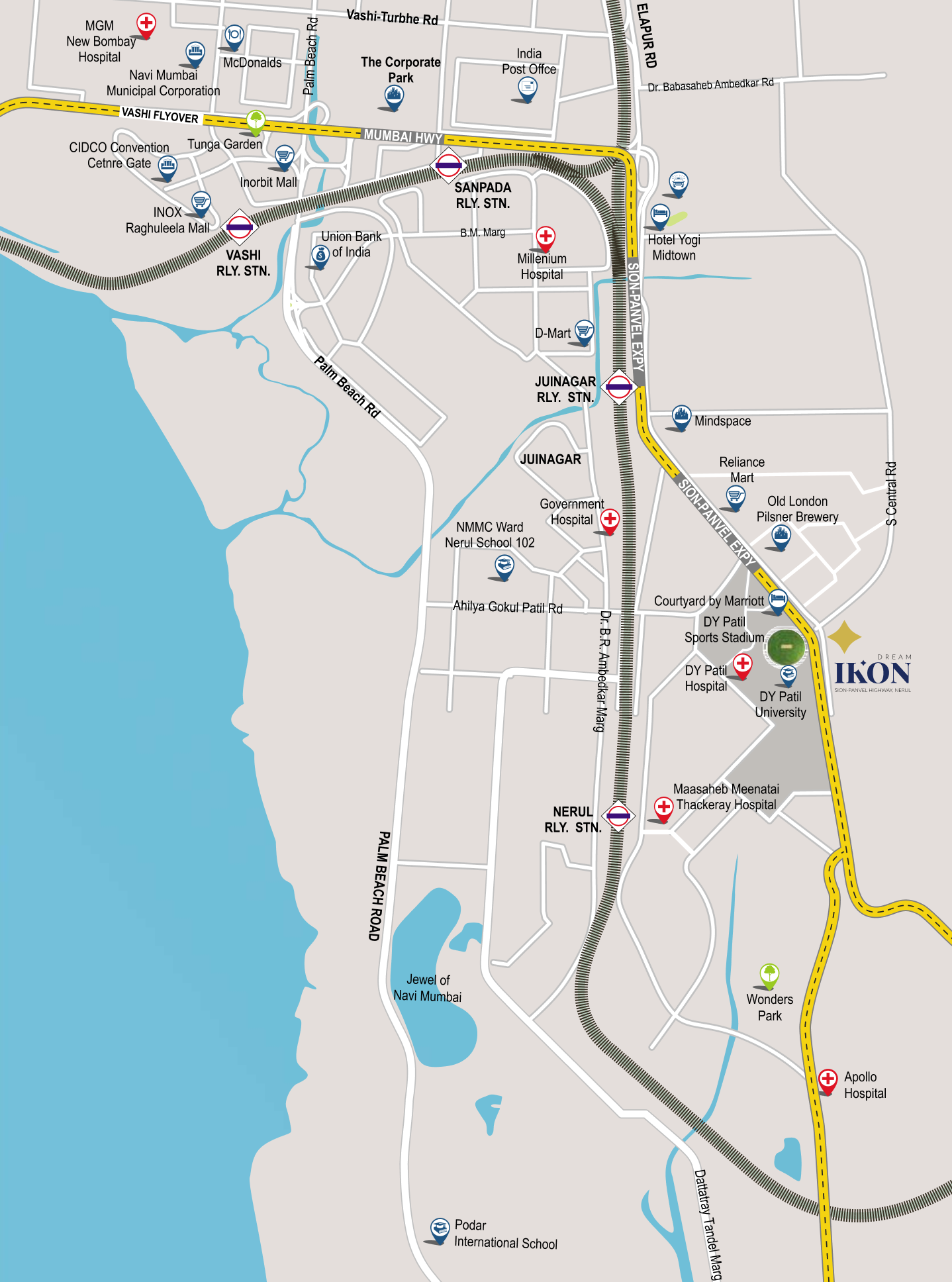 Nestled right opposite D. Y. Patil Stadium in Nerul, Dream Ikon opens a world of important conveniences that are accessible with ease. From key connectivity hubs to elite hotels, everything is just a short drive away.